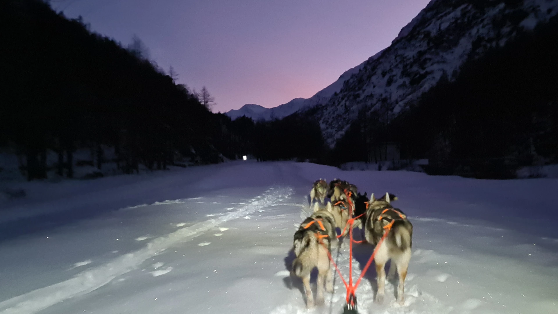 Der Event beginnt um 17:30 Uhr, wenn die Dämmerung einsetzt und der Mondschein die verschneite Landschaft von Zermeiggern in sanftes Licht taucht. Erlebt mit eurer Gruppe ein einzigartiges Wintererlebnis inmitten der stillen, tief verschneiten Wälder. Als Passagiere im Sportschlitten werdet ihr von einem kraftvollen Husky-Team über einen 2 km langen Trail gezogen – sicher geführt von unseren erfahrenen Guides.